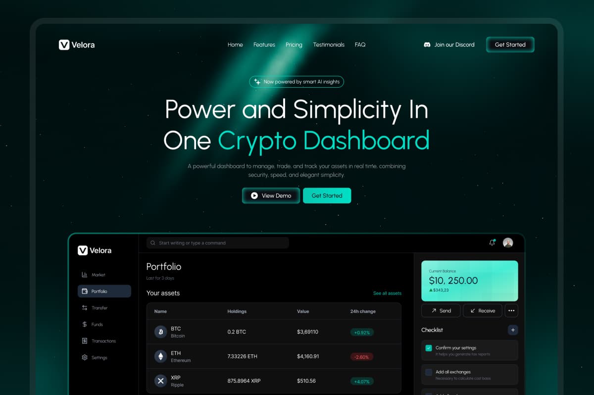A sleek, dark-mode crypto dashboard site designed to help users understand the product fast and act confidently. Every section focuses on clarity, guiding visitors from features to pricing with a consistent flow and premium UI.