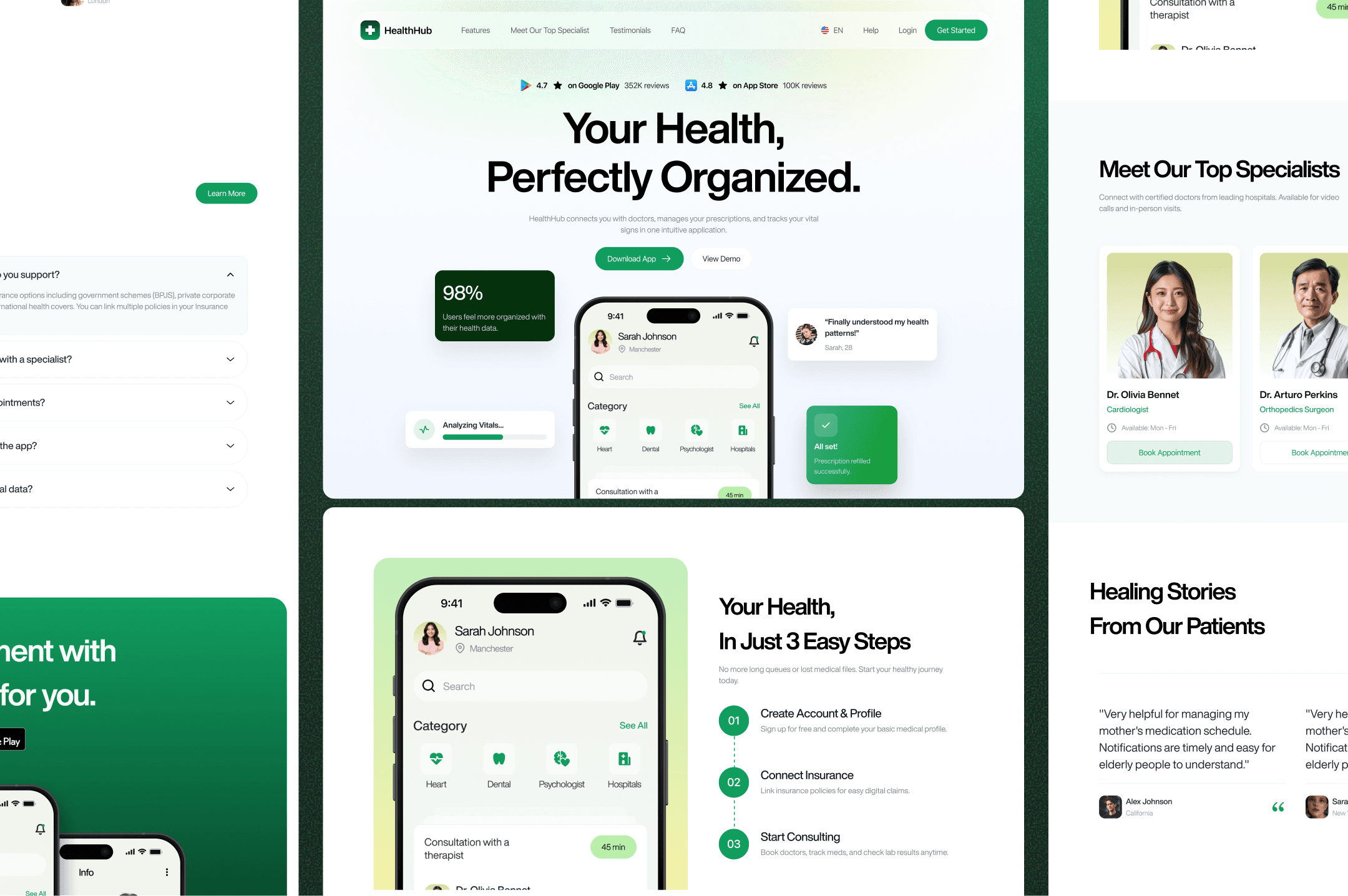 A calm, patient-focused website concept for a health app that organizes appointments, prescriptions, and insurance in one place. Designed to build trust through clarity and simple navigation.