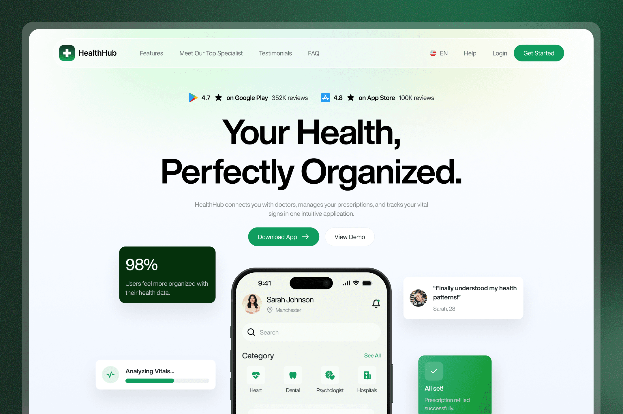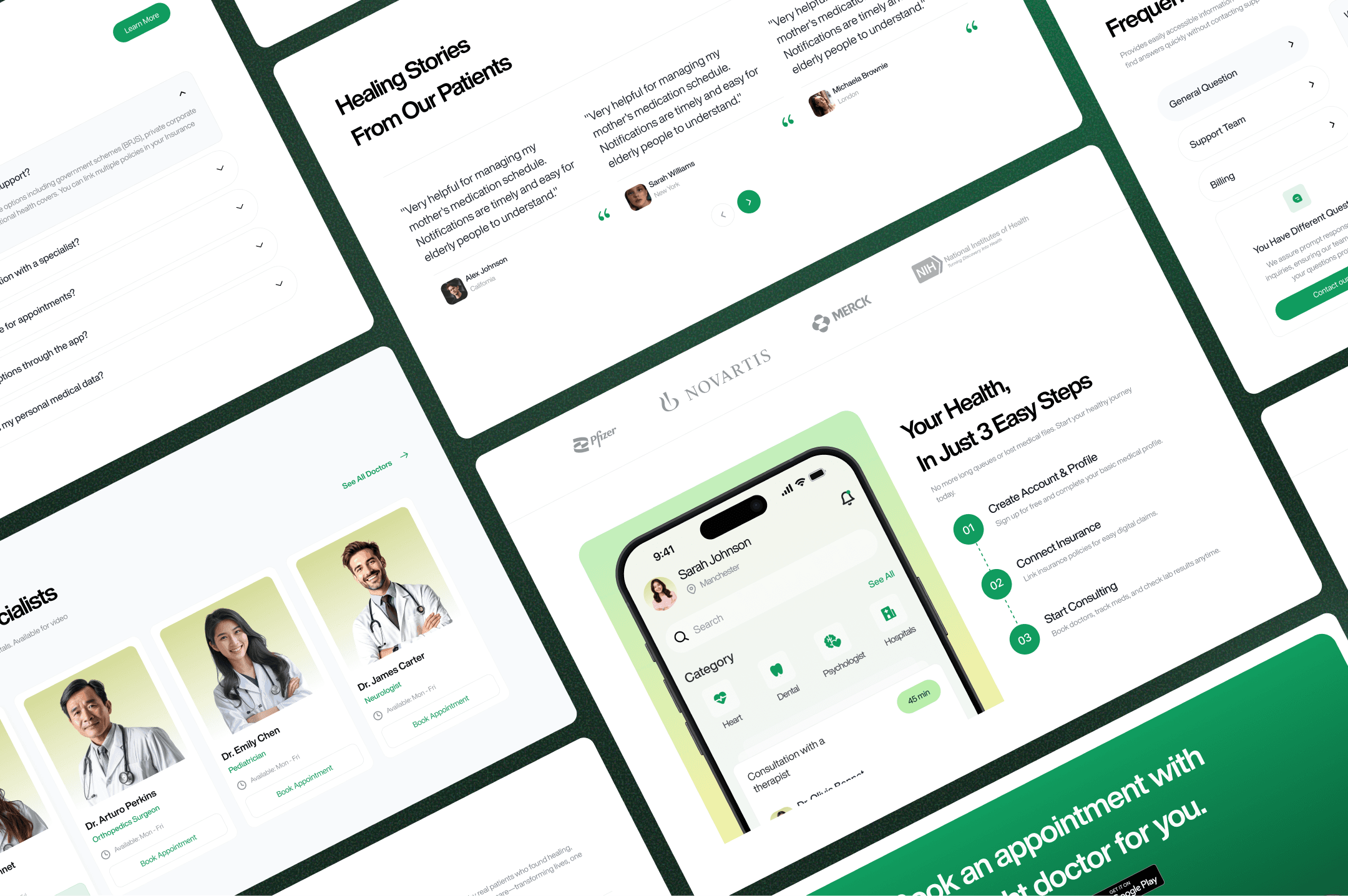 I structured the page like a guided journey — hero with app ratings and CTAs, then a dashboard preview showing how everything connects. A three-step onboarding explains the process, followed by featured specialists with “Book Appointment” buttons. Testimonials and FAQs build trust, while the closing CTA invites visitors to download the app and book a doctor. The visual language blends product UI with editorial simplicity.