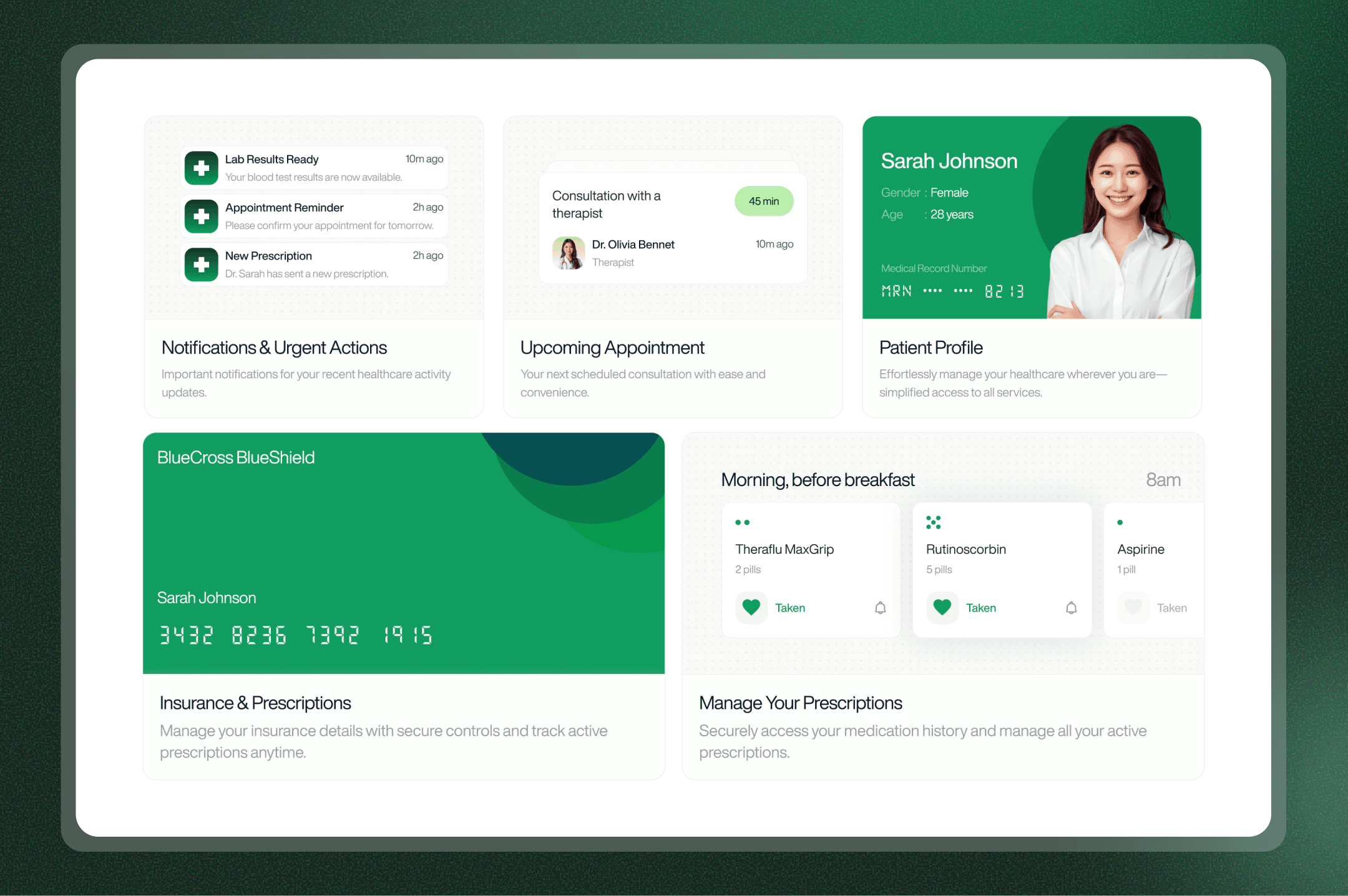 A calm, patient-focused website concept for a health app that organizes appointments, prescriptions, and insurance in one place. Designed to build trust through clarity and simple navigation.