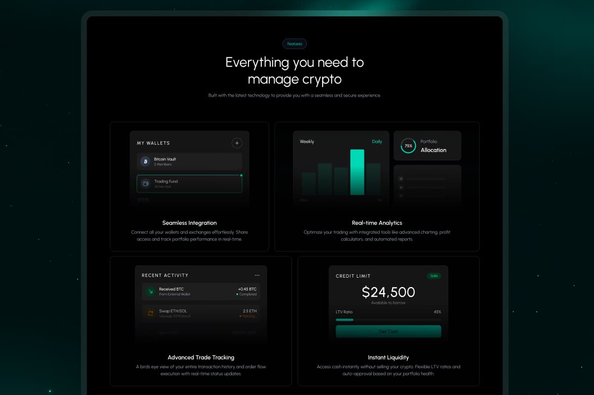 A sleek, dark-mode crypto dashboard site designed to help users understand the product fast and act confidently. Every section focuses on clarity, guiding visitors from features to pricing with a consistent flow and premium UI.